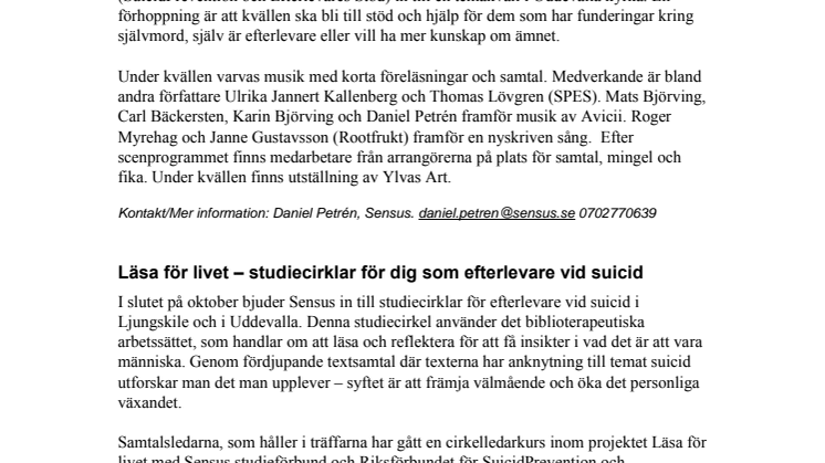 I slutet på oktober bjuder Sensus in till studiecirklar för efterlevare vid suicid i Ljungskile och i Uddevalla. Denna studiecirkel använder det biblioterapeutiska arbetssättet, som handlar om att läsa och reflektera för att få insikter i vad det är att vara människa. Genom fördjupande textsamtal där texterna har anknytning till temat suicid utforskar man det man upplever – syftet är att främja välmående och öka det personliga växandet.