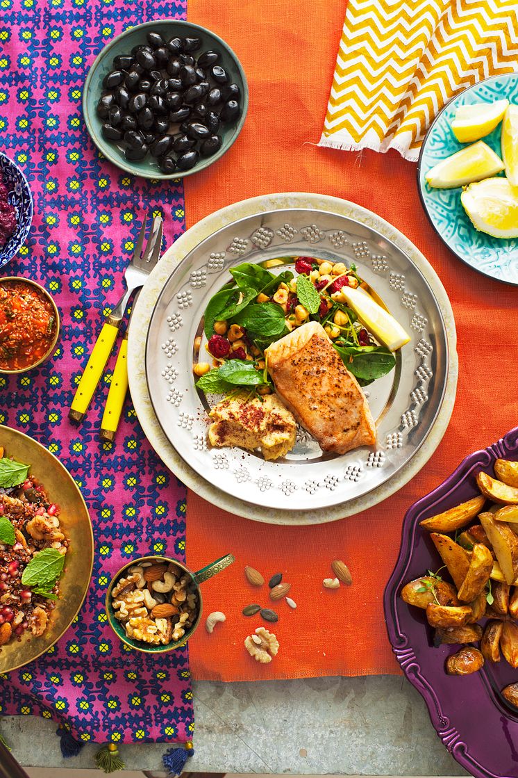 Härlig hälleflundra med ljummen hummus, i sällskap av ugnsrostad potatis och hasselnötssallad