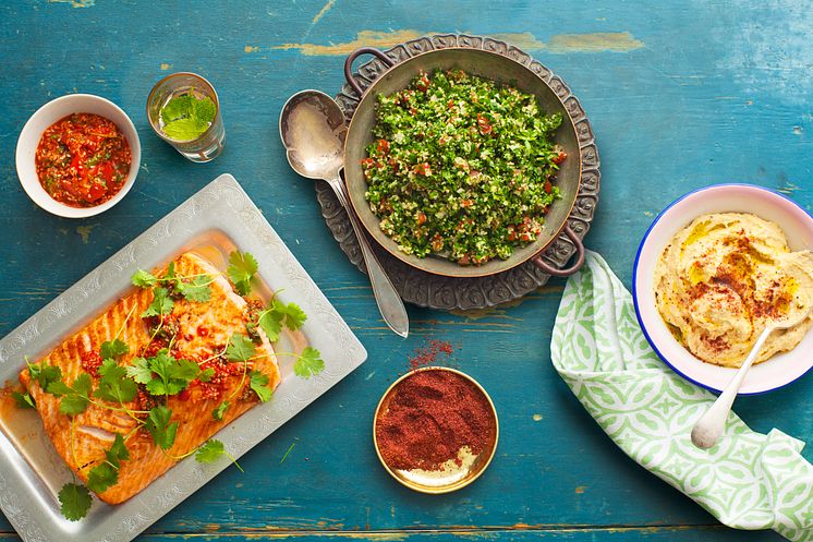 Halstrad lax med tabbouleh, het harissasalsa & solig hummus