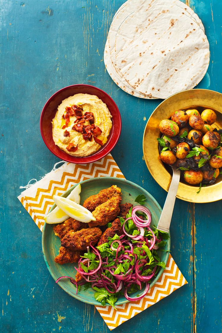 Kryddstarka lammfärsspett med rödlökssallad, olivpotatisar och rökig hummus