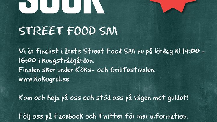 SOOK Streetfood är en av två finalister i Streetfood SM, som avgörs nu på lördag den 24 maj i Kungsträdgården. Finalmomentet är en cook-off, som kommer att avgöra vem som gör bäst streetfood i landet.