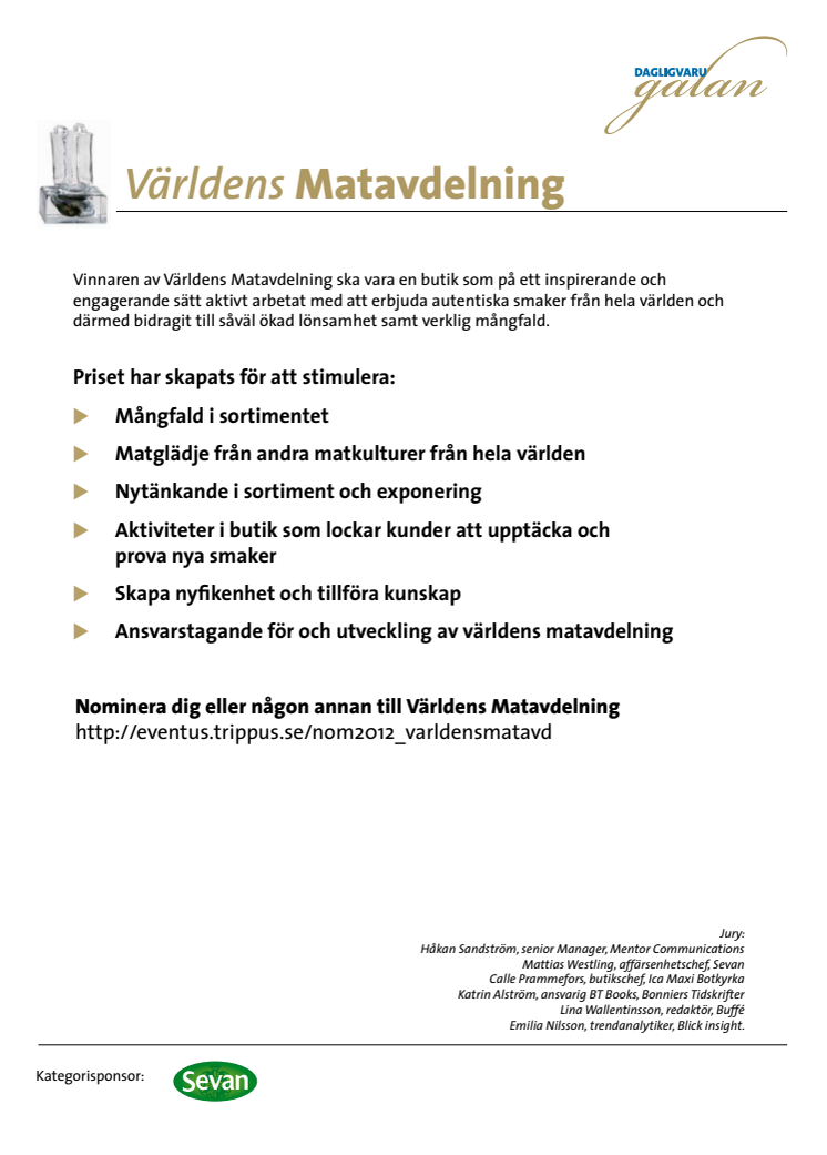 Nu är det hög tid att nominera den butik som du tycker ska vinna priset för Årets Världens Mat-avdelning! Vinnaren ska vara en butik som på ett inspirerande och engagerande sätt aktivt arbetat med att erbjuda autentiska smaker från hela världen och därmed bidragit till såväl ökad lönsamhet samt verklig mångfald.