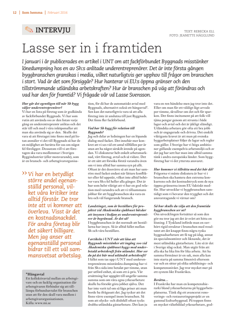 I januari i år publicerades en artikel i UNT om att fackförbundet Byggnads misstänker lönedumpning hos en av Sh:s anlitade underentreprenörer. Det är inte första gången byggbranschen granskas i media, vilket naturligtvis ger upphov till frågor om branschen i stort. Vad är det som försiggår? Hur är branschen på väg att förändras och vad har den för framtid? Vi frågade vår vd Lasse Svensson.