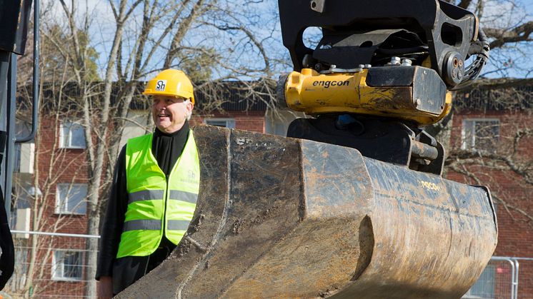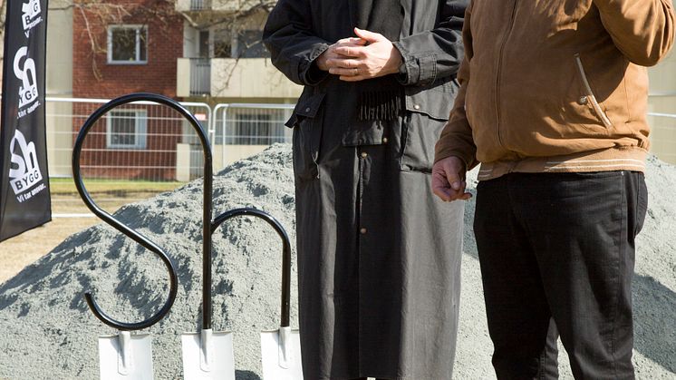 Östhammarshems vd Anders Erixon kikar på när en symbolisk första grop grävs.