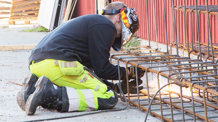 – Vi får så kallade armeringsspecifika ritningar skickade till oss och det är utifrån dessa vi vet hur vi ska armera. Tack vare dem kan vi också direkt se hur det ska se ut på plats och kan justera därefter, förklarar Roger innan han drar ner visiret på sin hjälm och börjar svetsa så att det sprakar och gnistrar.
