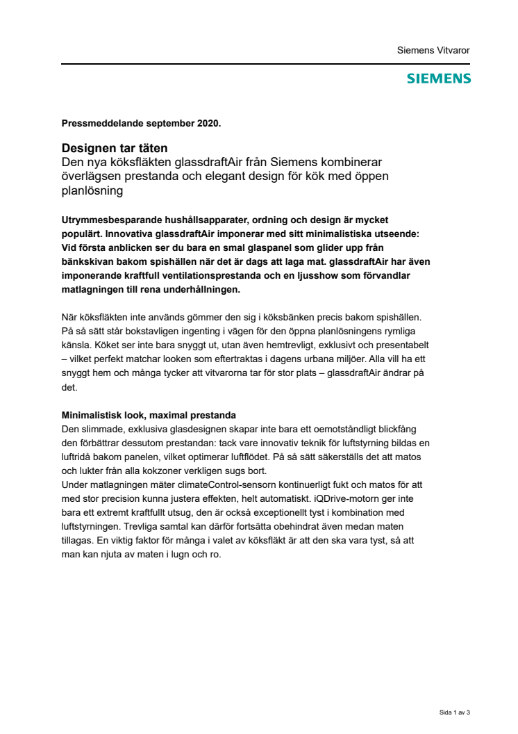 Designen tar täten. Den nya köksfläkten glassdraftAir från Siemens kombinerar överlägsen prestanda och elegant design för kök med öppen planlösning