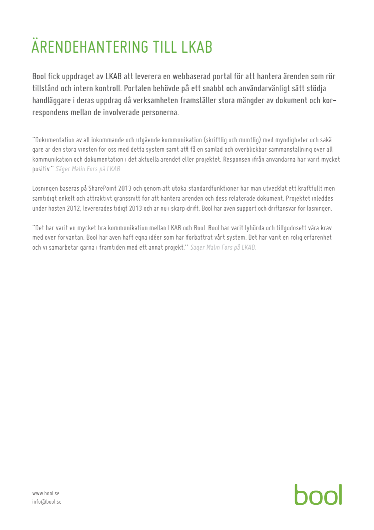Bool fick uppdraget av LKAB att leverera en webbaserad portal för att hantera ärenden som rör tillstånd och intern kontroll. Portalen behövde på ett snabbt och användarvänligt sätt stödja handläggare i deras uppdrag då verksamheten framställer stora mängder av dokument och korrespondens mellan de involverade personerna.