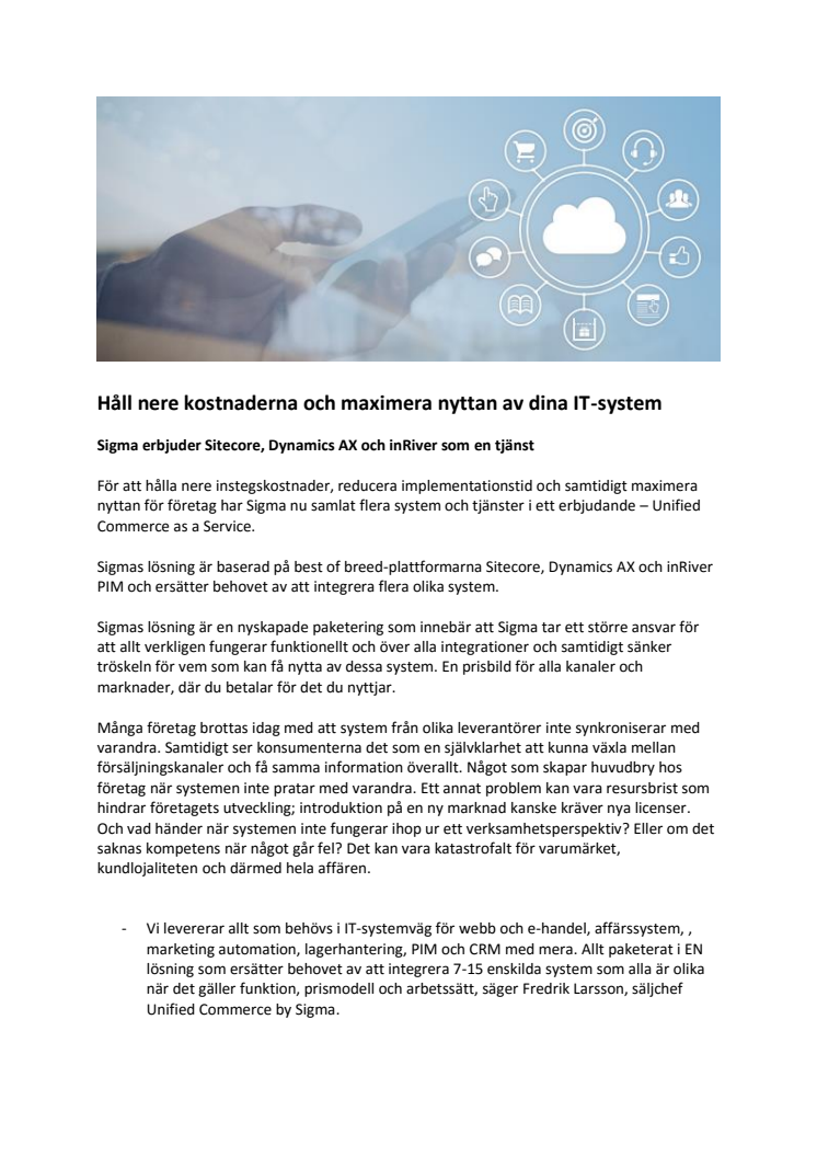 Sigma lanserar som första svenska företag Unified Commerce as a Service, en helhetslösning med alla systemfunktioner som krävs för att bedriva en säljande verksamhet, baserad på best of breed-plattformarna Sitecore, Dynamics AX och inRiver PIM.