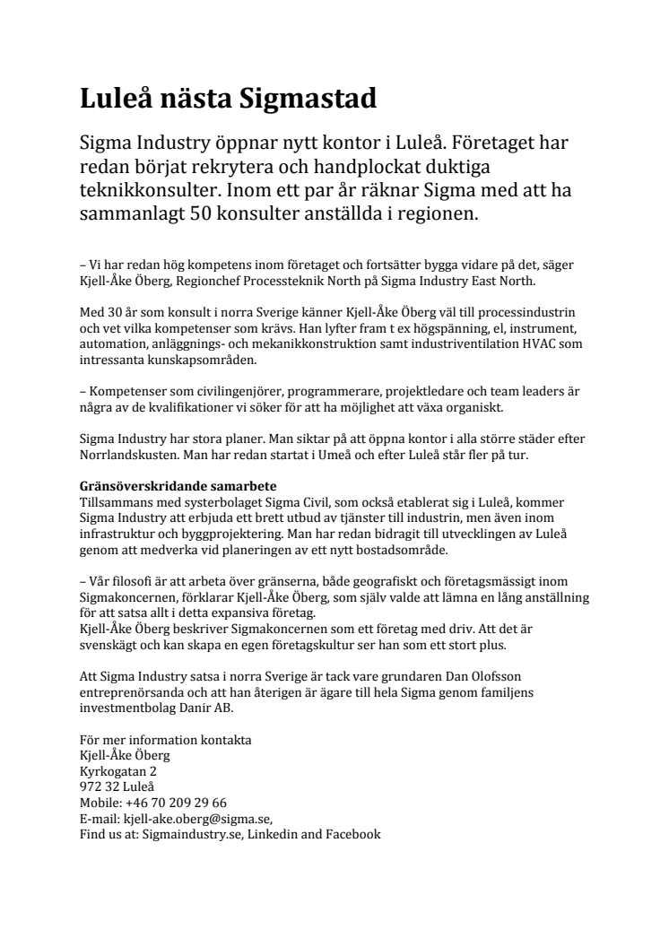 Sigma Industry öppnar nytt kontor i Luleå. Företaget har redan börjat rekrytera och handplockat duktiga teknikkonsulter. Inom ett par år räknar Sigma med att ha sammanlagt 50 konsulter anställda i regionen.