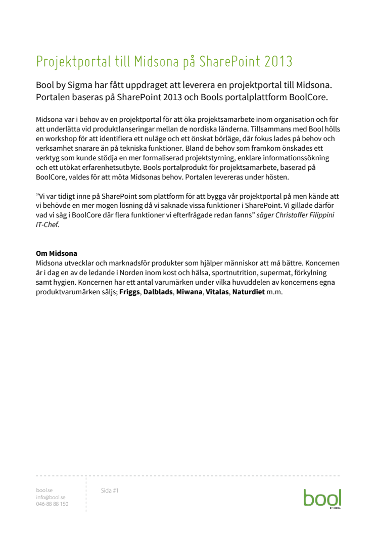 Bool by Sigma har fått uppdraget att leverera en projektportal till Midsona. Portalen baseras på SharePoint 2013 och Bools portalplattform BoolCore.