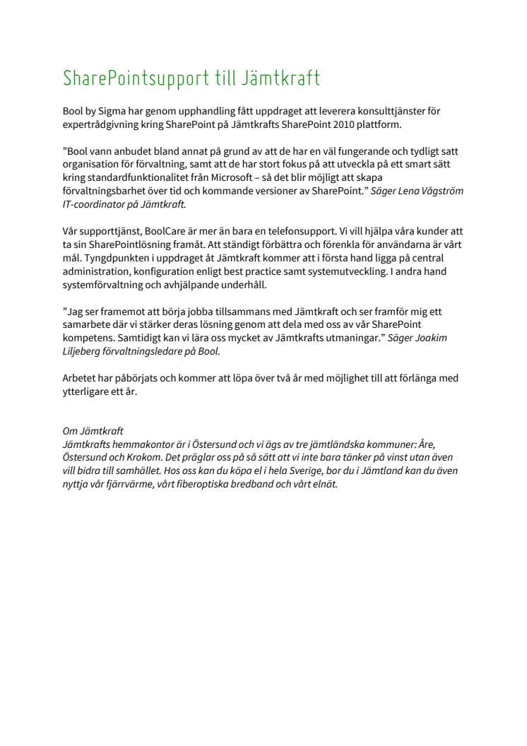 Bool by Sigma har genom upphandling fått uppdraget att leverera konsulttjänster för expertrådgivning kring SharePoint på Jämtkrafts SharePoint 2010 plattform.