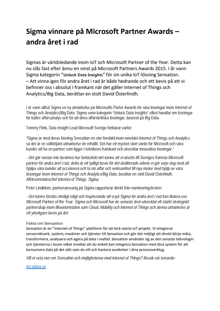 Sigmas är världsledande inom IoT och Microsoft Partner of the Year. Detta kan nu slås fast efter ännu en vinst på Microsoft Partners Awards 2015. I år vann Sigma kategorin ”Unlock Data Insights” för sin unika IoT-lösning Sensation.