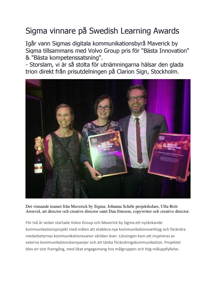 Igår vann Sigmas digitala kommunikationsbyrå Maverick by Sigma tillsammans med Volvo Group pris för "Bästa Innovation" & "Bästa kompetenssatsning".