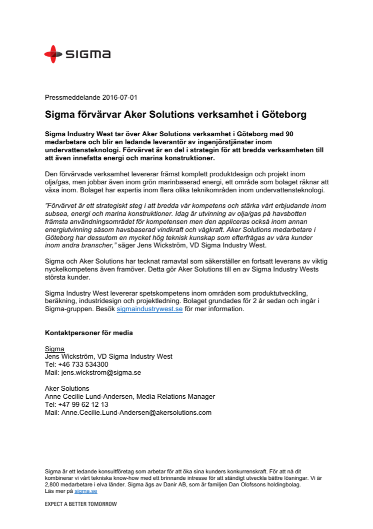 Sigma är ett ledande konsultföretag som arbetar för att öka sina kunders konkurrenskraft. För att nå dit kombinerar vi vårt tekniska know-how med ett brinnande intresse för att ständigt utveckla bättre lösningar. Vi är 5 000 medarbetare i sexton länder. Sigma ägs av Danir AB, som är familjen Dan Olofssons holdingbolag.