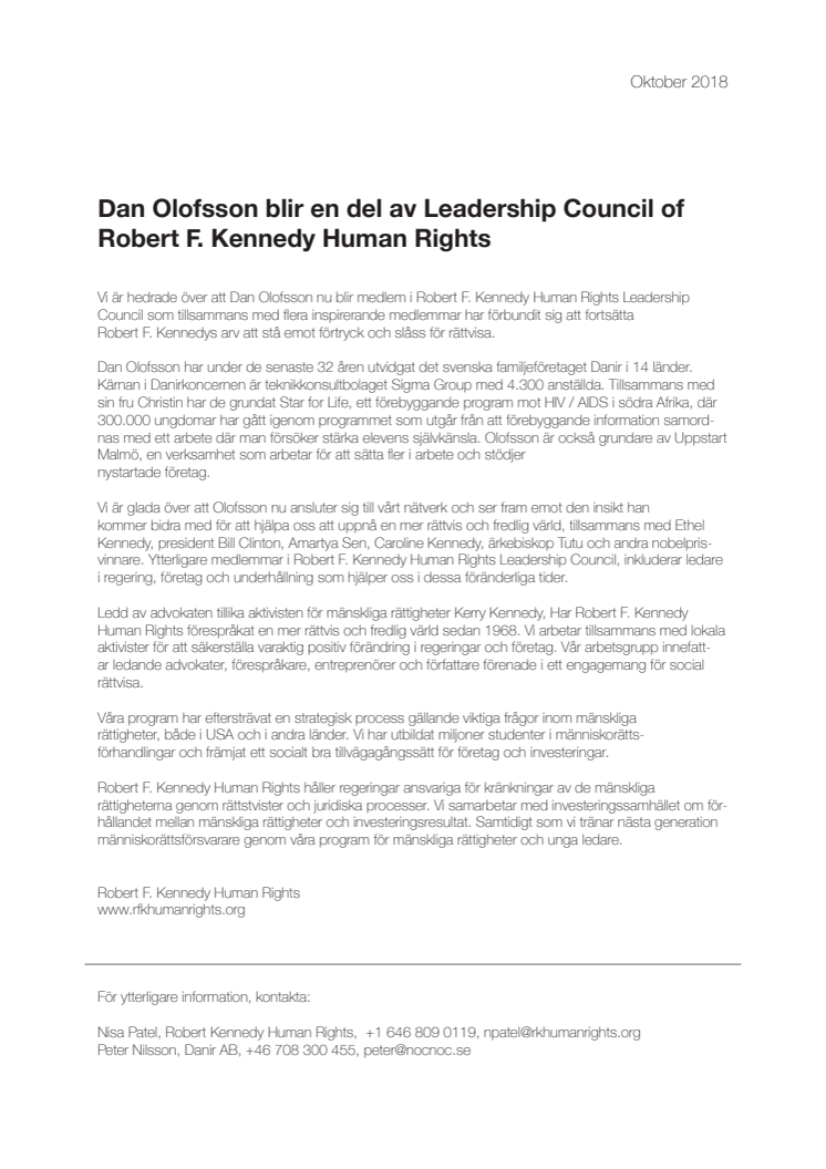 • Sigmas grundare Dan Olofsson blir en del av Leadership Council of Robert F. Kennedy Human Rights