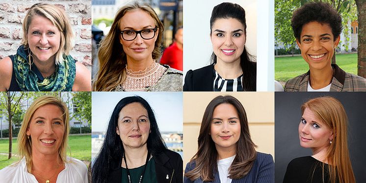 • SSWS talare i oktober. Övre raden f v: Carolina Jonnor, Tuva Palm, Leila Karchaoui och Diana Paz. Nedre raden f v: Jeanette Lilja, Helena Lönegård, Apollonia San Contreras och Christina Persson.