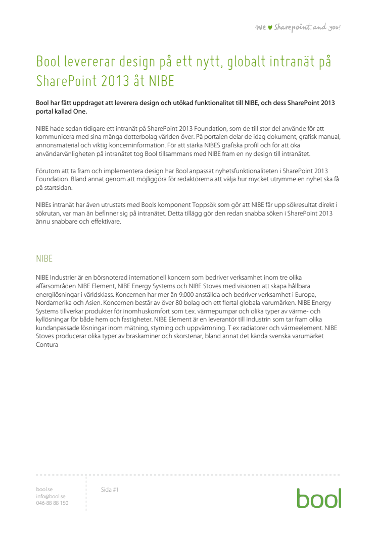 Bool har fått uppdraget att leverera design och utökad funktionalitet till NIBE, och dess SharePoint 2013 portal kallad One.