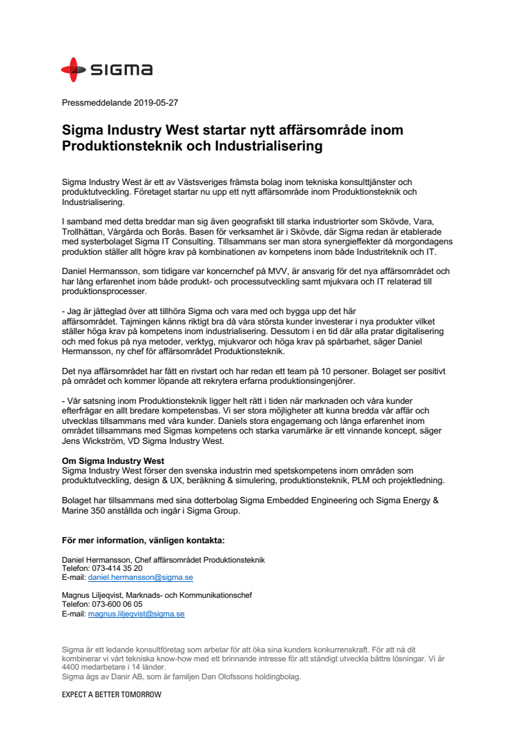 - Vår satsning inom Produktionsteknik ligger helt rätt i tiden när marknaden och våra kunder efterfrågar en allt bredare kompetensbas. Vi ser stora möjligheter att kunna bredda vår affär och utvecklas tillsammans med våra kunder. Daniels stora engagemang och långa erfarenhet inom området tillsammans med Sigmas kompetens och starka varumärke är ett vinnande koncept, säger Jens Wickström, VD Sigma Industry West.