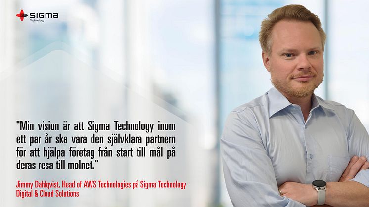 ”Jag valde Sigma Technology då jag anser att bolaget befinner sig i en väldigt intressant fas med stark tillväxt med stora möjligheter att påverka och bygga från grunden. Min vision är att Sigma Technology inom ett par år ska vara den självklara partnern för att hjälpa företag från start till mål på deras resa till molnet”. Säger Jimmy Dahlqvist, ny Head of AWS Technologies.
