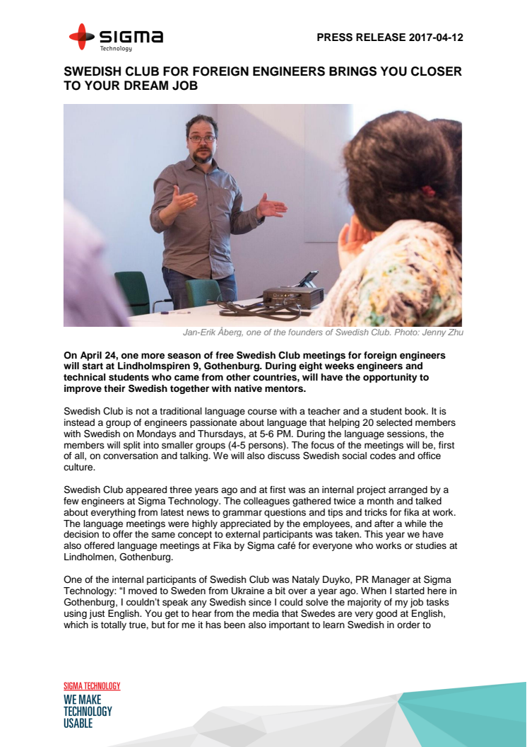 Sigma Technology är ett internationellt konsultföretag som tillhandahåller tjänster inom produktinformation, inbyggda system och mjukvarudesign, samt information management. Swedish Club är vår plattform för att hjälpa utländska ingenjörer i Sverige förbättra sina språkfärdigheter och integrera i samhället snabbare. Vi erbjuder en grupp mentorer som hjälper dig oavsett vilken nivå du råkar vara på. De ger dig feedback på vad du säger och skriver.