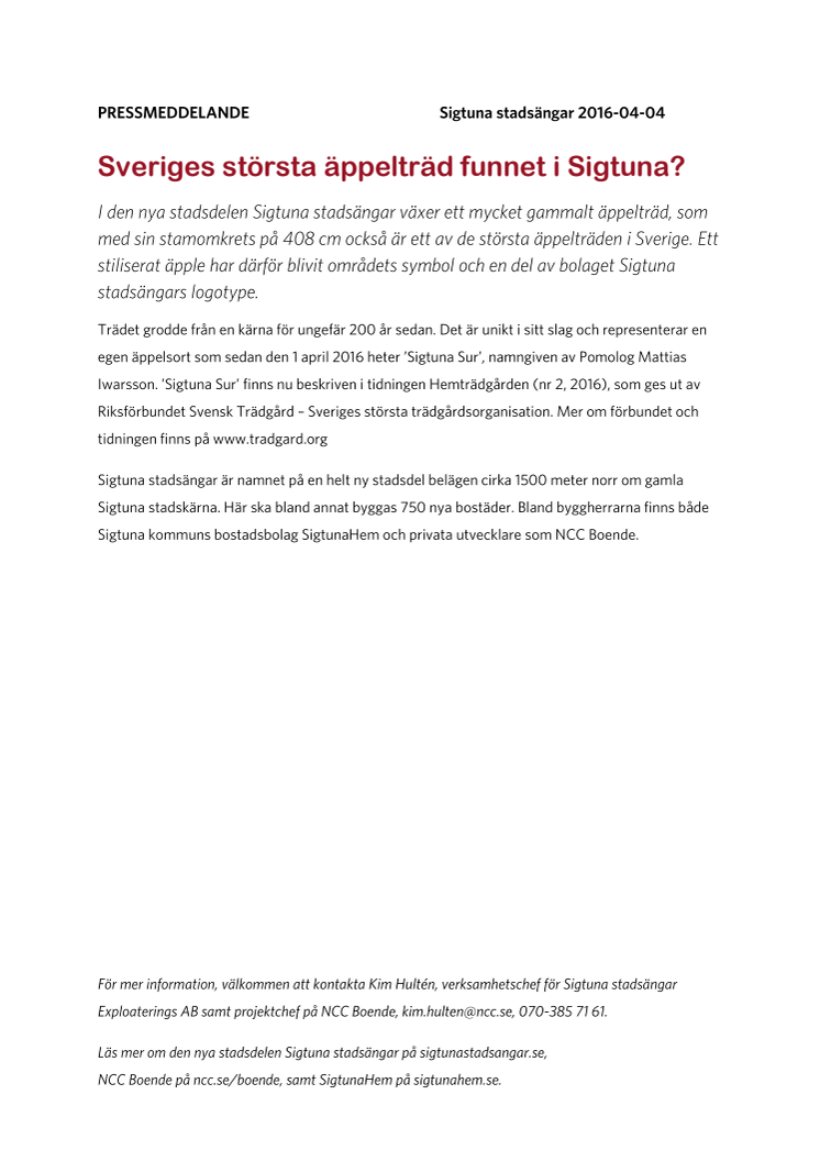 I den nya stadsdelen Sigtuna stadsängar växer ett mycket gammalt äppelträd, som med sin stamomkrets på 408 cm också är ett av de största äppelträden i Sverige. Ett stiliserat äpple har därför blivit områdets symbol och en del av bolaget Sigtuna stadsängars logotype.