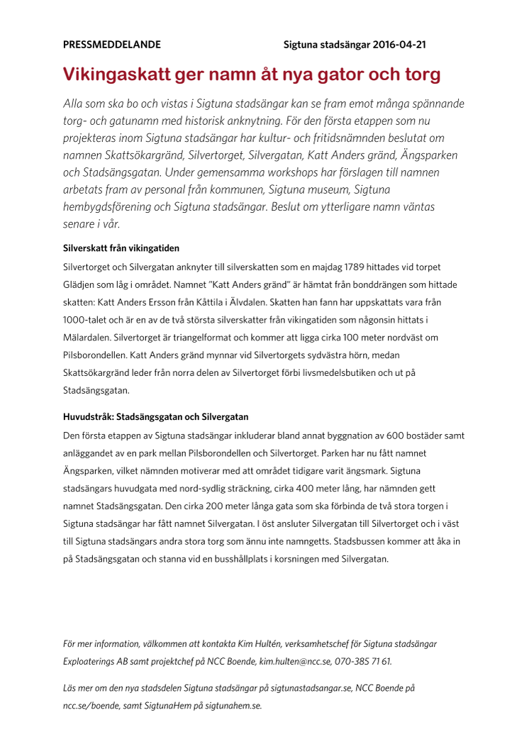 Alla som ska bo och vistas i Sigtuna stadsängar kan se fram emot många spännande torg- och gatunamn med historisk anknytning. För den första etappen som nu projekteras inom Sigtuna stadsängar har kultur- och fritidsnämnden beslutat om namnen Skattsökargränd, Silvertorget, Silvergatan, Katt Anders gränd, Ängsparken och Stadsängsgatan.