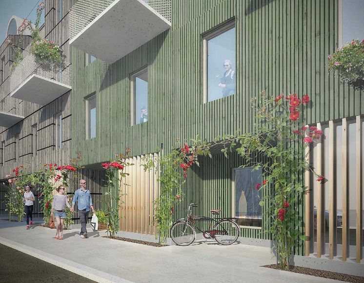 Illustration av hur vi ser att fasaden mot gatan kan te sig med indragna entréer till townhouse och användande av den möjliga odlingsremsan utmed fasaderna.
