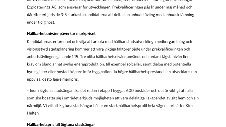 – Vi skickar ut en skriftlig inbjudan till intressanta utvecklare nu i april, och ber om en intresseanmälan senast den 2 maj berättar Kim Hultén, verksamhetschef för Sigtuna stadsängar Exploaterings AB, som ansvarar för utvecklingen. Prekvalificeringen pågår under maj månad och därefter erbjuds de 3-5 starkaste kandidaterna att delta i en anbudstävling med anbudsinlämning under tidig höst.