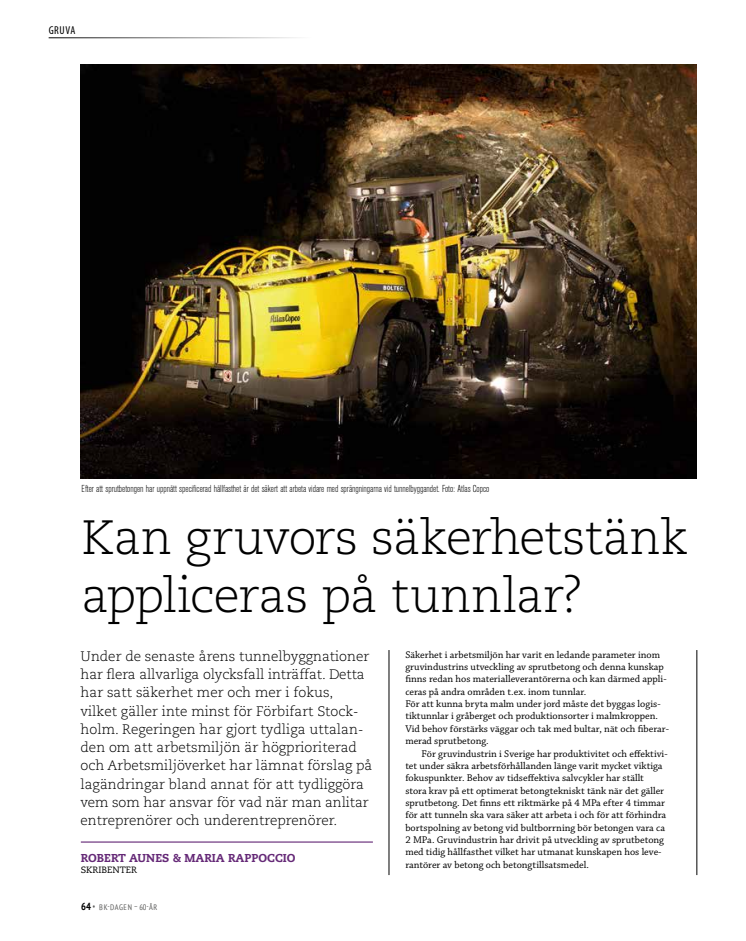 Sika har som tillsatsmedelsleverantör utvecklat betongrecept och acceleratorer som klarar de ställda kraven i olika typer av gruvor. Med den tekniska kompetens som finns att utgå från och med modern testutrustning går det snabbt att utveckla produkter för en tunnels varierande förutsättningar så att de klarar det som krävs för ett effektivt och säkert tunnelbyggande.