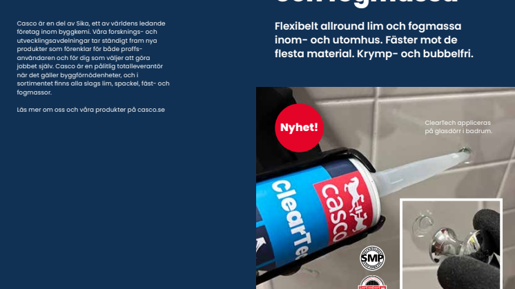 Sika Sverige släpper med stor stolthet sin senaste nyhet inom lim- och fogmassa; Casco ClearTech, ett kristallklart flexibelt lim och fogmassa. ClearTech fäster mot de flesta material, fungerar lika bra inom- som utomhus och fram för allt, fogen förblir kristallklar när den härdat.