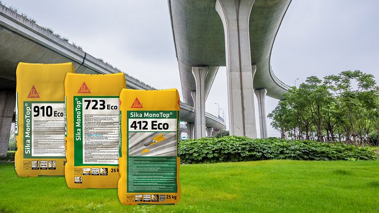 Våra reparationsbruker Sika MonoTop®-412 Eco och Sika MonoTop®-723 Eco har ett minskat innehåll av Portlandcement och reducerar därmed sitt koldioxidavtryck med 15 % samtidigt som korrosionsskyddet Sika MonoTop®-910 Eco saknar mjukgörare helt, vilket ger ett minskat koldioxidavtryck med 25 % jämfört med motsvarande produkter.