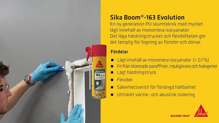 Sika Boom-163 Evolution är det senaste tillskottet till Sikas nya skumsortiment och som med sina fantastiska egenskaper ger nya förutsättningar på fogskumsmarknaden. ”Vi har tagit fram ett skum som har efterfrågats av marknaden både när det gäller prestanda och miljöaspekten” säger Mats Jansson, Produktchef på Sika Sverige.