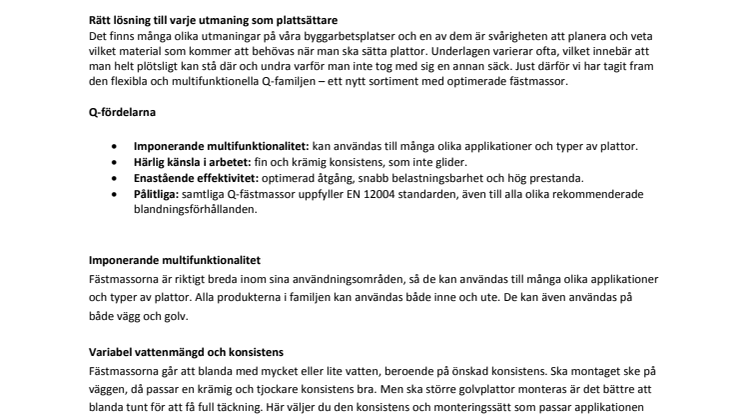 - Pålitliga: samtliga Q-fästmassor uppfyller EN 12004 standarden, även till alla olika rekommenderade blandningsförhållanden.
