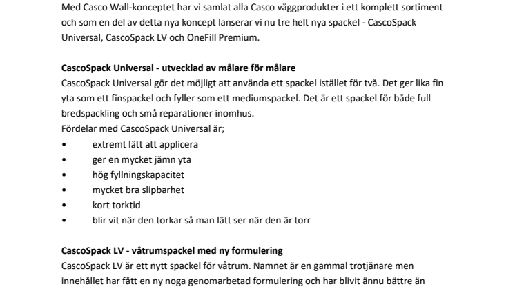 Med Casco Wall-konceptet har vi samlat alla Casco väggprodukter i ett komplett sortiment och som en del av detta nya koncept lanserar vi nu tre helt nya spackel - CascoSpack Universal, CascoSpack LV och OneFill Premium.