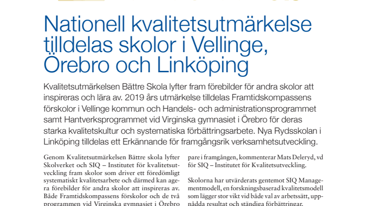Kvalitetsutmärkelsen Bättre Skola lyfter fram förebilder för andra skolor att inspireras och lära av. 2019 års utmärkelse tilldelas Framtidskompassens förskolor i Vellinge kommun och Handels- och administrationsprogrammet samt Hantverksprogrammet vid Virginska gymnasiet i Örebro för deras starka kvalitetskultur och systematiska förbättringsarbete. Nya Rydsskolan i Linköping tilldelas ett Erkännande för framgångsrik verksamhetsutveckling.