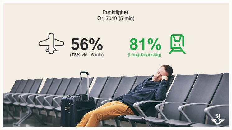 Statistik från Trafikverket och Flightstats visar att långdistanstågens punktlighet första kvartalet 2019 låg på 81 procent (inom 5 min). Under samma tid var flygets punktlighet 78 procent (inom 15 min).