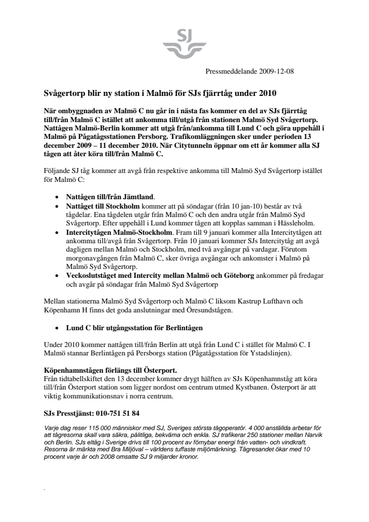 När ombyggnaden av Malmö C går in i nästa fas kommer en del av SJs fjärrtåg till/från Malmö C istället att trafikera stationen Malmö Syd Svågertorp. Nattågen Malmö-Berlin kommer att utgå från Lund C och göra uppehåll i Malmö på pågatågsstationen Persborg. Trafikomläggningen sker under perioden 13 december 2009 – 11 december 2010.
