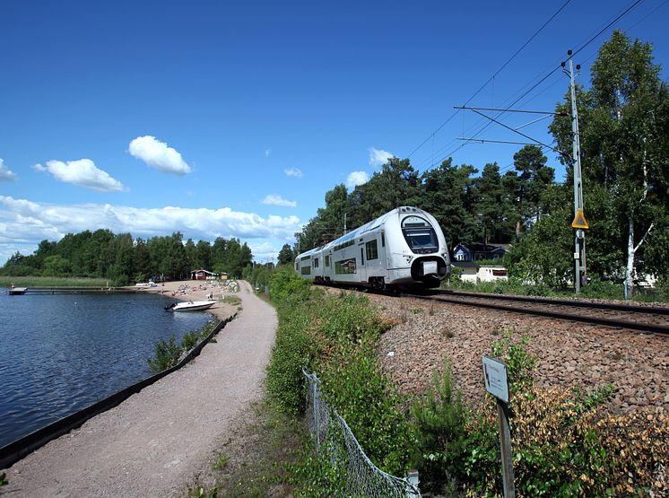En av SJs dubbeldäckare passerar vatten i Kvicksund.