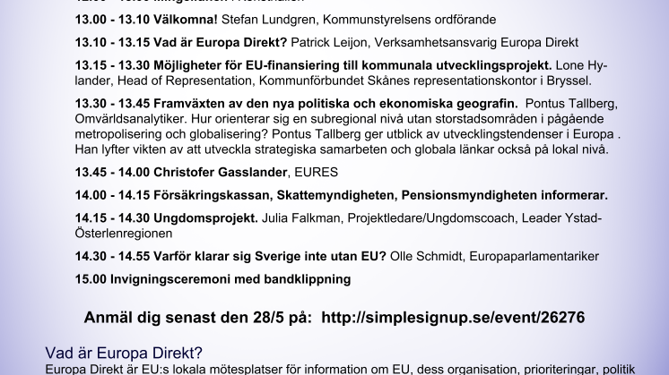 På programmet finns Olle Schmidt Europaparlamentariker, Stefan Lundgren Sjöbo kommunstyrelsens ordförande, Patrick Leijon, Europa Direkt, Pontus Tallberg Omvärldsanalytiker, Lone Hylander Kommunförbundet Skånes representationskontor i Bryssel, Julia Falkman Projektledare/Ungdomscoach, Leader YstadÖsterlenregionen och information från EURES, Försäkringskassan, Skattemyndigheten och Pensionsmyndigheten.