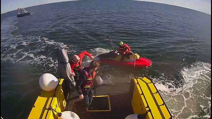 Dessutom upptäckte han att mannen var förankrad med säkerhetslina i SUP:en. Den rådige fiskaren skar av linan med en kniv, och Ian Wilson kunde köra och möta stationens större båt där de frivilliga sjöräddarna Peter Sundin, Erik Ahlsten och Daniel Nilsson snabbt och systematiskt tog ombord mannen. Väl ombord placerade de honom ute på däck i solvärmen vid det varma utblåset från motorrummet. Den vattenfyllda torrdräkten klipptes upp, och mannen sveptes in i varma filtar för att få upp kroppstemperaturen.