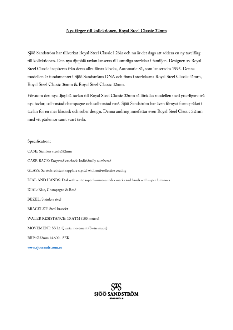 Sjöö Sandström har tillverkat Royal Steel Classic i 26år och nu är det dags att addera flera ny tavelfärger till kollektionen. Designen av Royal Steel Classic inspireras från deras allra första klocka, Automatic S1, som lanserades 1993. Denna modellen är fundamentet i Sjöö Sandströms DNA och finns i storlekarna Royal Steel Classic 41mm, Royal Steel Classic 36mm & Royal Steel Classic 32mm.