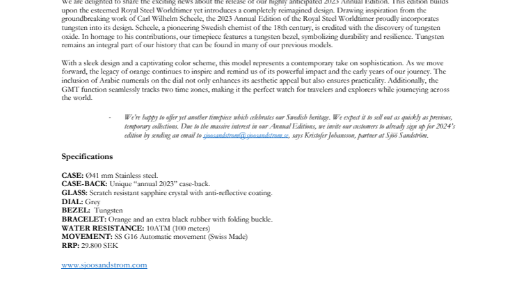 - Det är med glädje vi lanserar ännu en klocka som hyllar vårt svenska arv. Vi förväntar oss att modellen kommer att sälja slut lika snabbt som våra tidigare begränsade kollektioner. Med anledning av detta uppmuntrar vi våra kunder och intressenter att anmäla intresse för 2024 års Annual Edition redan nu, genom att maila sjoosandstrom@sjoosandstrom.se, säger Kristofer Johansson, partner på Sjöö Sandström