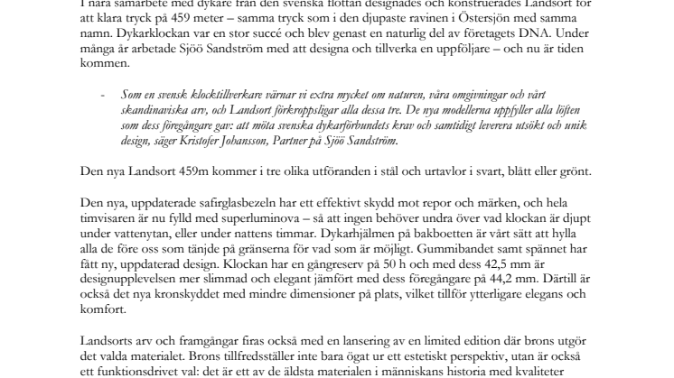 Svenska klocktillverkaren Sjöö Sandström etablerades 1986 och lanserade den första svenska dykarklockan ”Landsort” 2011. Sjöö Sandström lanserar nu en ny version av den unika klockan i tre olika utföranden samt en limited edition- modell.