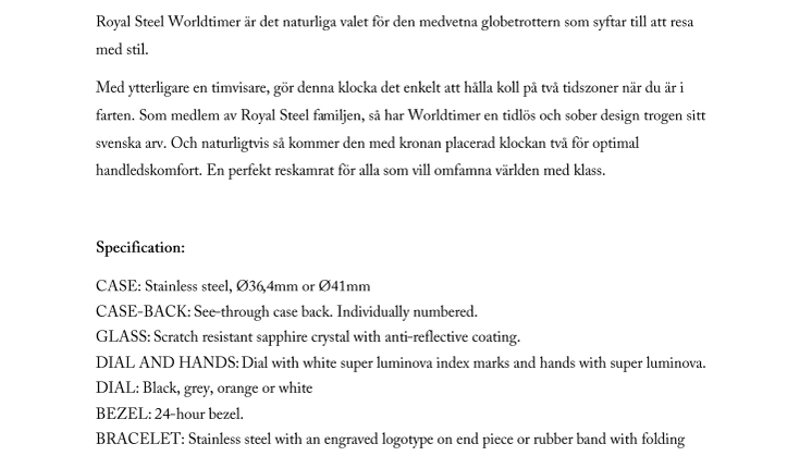 Med ytterligare en timvisare, gör denna klocka det enkelt att hålla koll på två tidszoner när du är i farten. Som medlem av Royal Steel familjen, så har Worldtimer en tidlös och sober design trogen sitt svenska arv. Och naturligtvis så kommer den med kronan placerad klockan två för optimal handledskomfort. En perfekt reskamrat för alla som vill omfamna världen med klass.