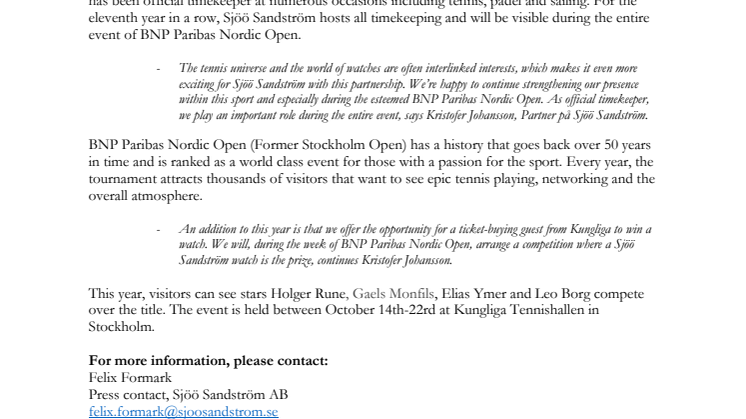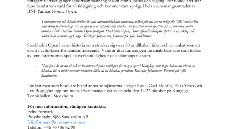 - Tennissporten och klockvärlden är ofta sammanlänkade intressen, vilket gör det extra roligt för Sjöö Sandström med detta partnerskap. Vi är glada över att fortsätta stärka vår position inom sporten och i synnerhet under anrika BNP Paribas Nordic Open (tidigare Stockholm Open). Som officiell tidtagare spelar vi en viktig roll under hela evenemanget, säger Kristofer Johansson, Partner på Sjöö Sandström.