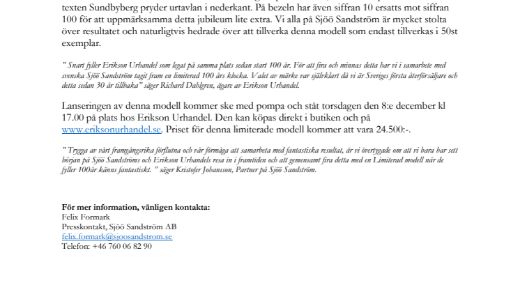 ” Snart fyller Erikson Urhandel som legat på samma plats sedan start 100 år. För att fira och minnas detta har vi i samarbete med svenska Sjöö Sandström tagit fram en limiterad 100 års klocka. Valet av märke var självklart då vi är Sveriges första återförsäljare och detta sedan 30 år tillbaka” säger Richard Dahlgren, ägare av Erikson Urhandel.