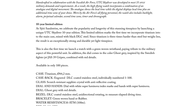 Sjöö Sandström firar UTC Skydivers 10-årsjubileum med att lansera en unik version av denna fantastiska klocka i en begränsad upplaga. Detta är första gången vi använder titan i boetten, blandat med svart DLC-behandlat stål. Då titan är tre gånger hårdare än stål men väger mindre, är resultatet en exceptionellt tålig men ändå lätt klocka.