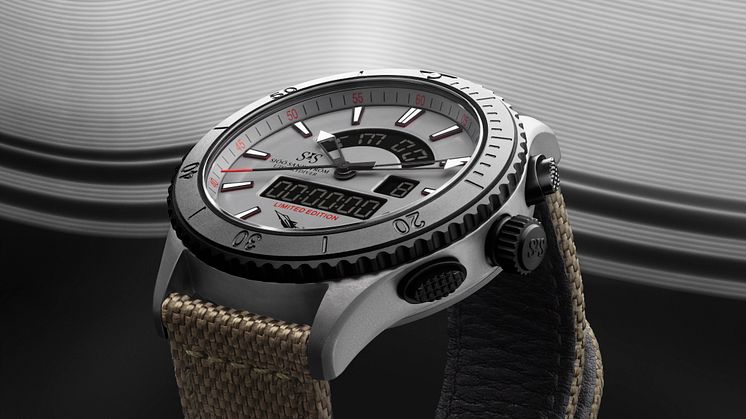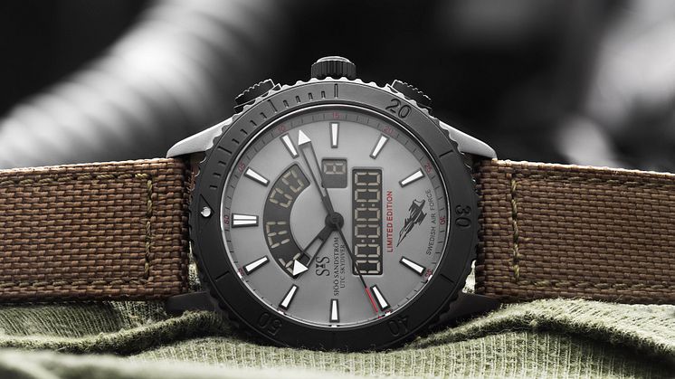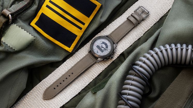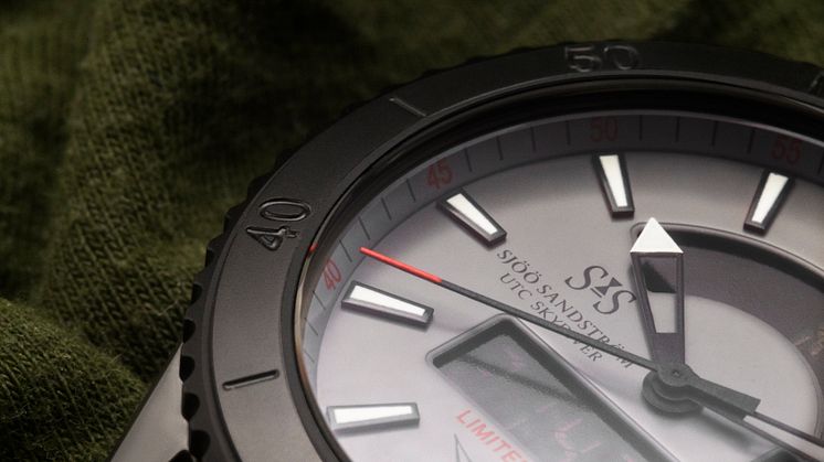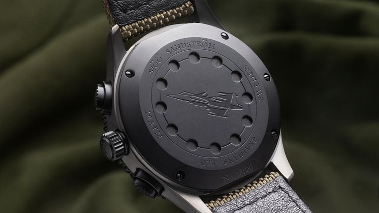 Detta är också första gången vi lanserar en klocka med ett vävt armband, i en grön färg som hyllar UTC Skydivers militära ursprung. Urtavlan har färgen Ghost grey, inspirerad av det svenska stridsflyget JAS 39 Gripen, kombinerat med röda detaljer.