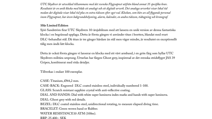 UTC Skydiver är utvecklad tillsammans med det svenska Flygvapnet utifrån bland annat 35 specifika krav. Resultatet är en unik klocka med både ett analogt och ett digitalt urverk. Det analoga urverket visar lokal tid medan det digitala visar lokal tid plus en extra tidszon efter eget val. Klockan, som bärs av all flygande personal inom Flygvapnet, har även bakgrundsbelysning, alarm, kalender, en andra tidszon, tidtagning och kronograf.