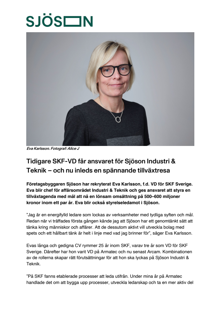 Företagsbyggaren Sjöson har rekryterat Eva Karlsson, f.d. VD för SKF Sverige. Eva blir chef för affärsområdet Industri & Teknik och ges ansvaret att styra en tillväxtagenda med mål att nå en lönsam omsättning på 500–600 miljoner kronor inom ett par år. Eva blir också styrelseledamot i Sjöson.